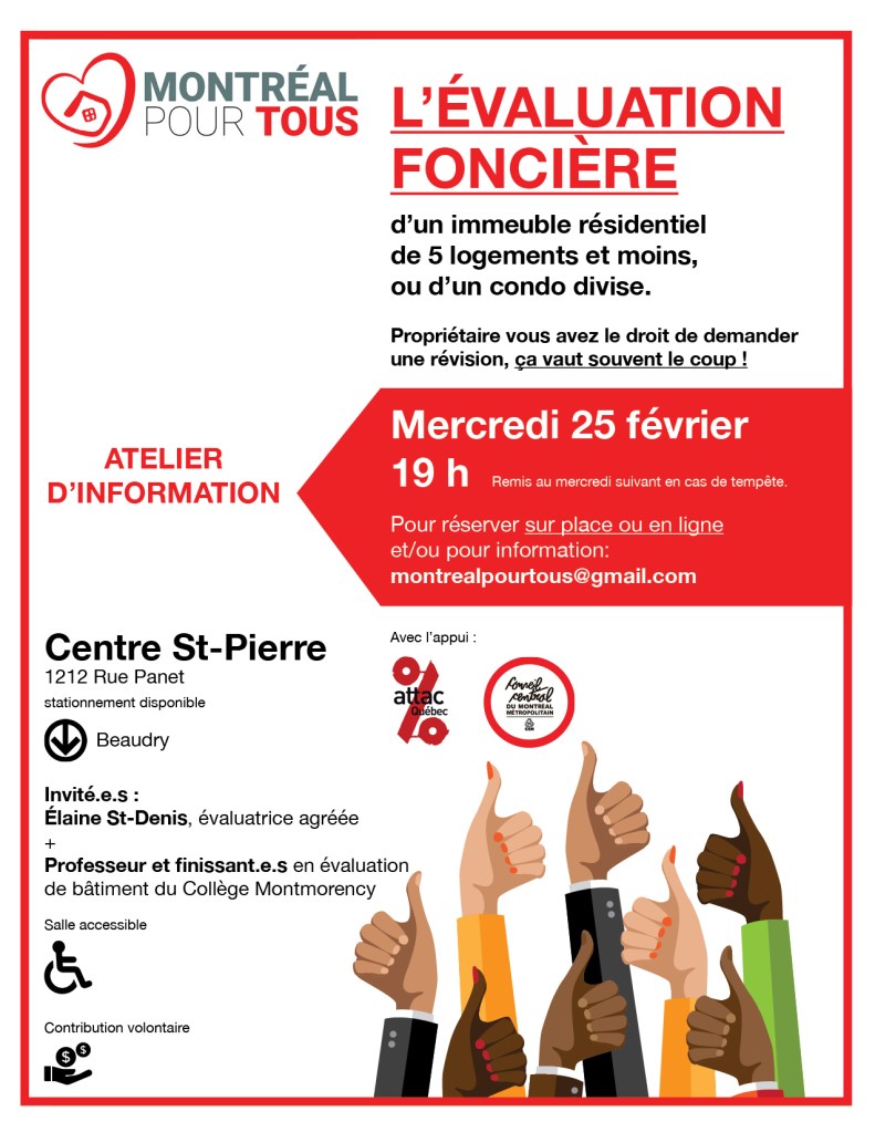 Propriétaire, vous avez intérêt à bien comprendre comment la Ville de Montréal évalue votre résidence, si les informations et les comparaisons sont exactes, si ça vaut le coût de déposer une demande de révision permise par la Loi. Nos ateliers d’information gratuits avec expert bénévole et outils de comparaison ont permis d’obtenir des baisses importantes de valeur puis de taxes sur 3 ans.