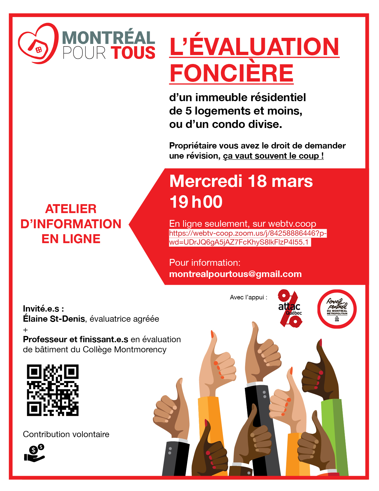 Bonjour, nous espérons que vous allez bien. Veuillez nous excuser si vous recevez ce message une 2e fois. 1-Atelier d’information sur l’évaluation foncière du mercredi 18 mars 2026 à 19h00 sur Zoom Nous vous transmettons cette invitation à participer en ligne à notre Atelier d’information sur l’évaluation foncière du mercredi 18 mars 2026 à 19h00 sur Zoom. Le lien est le suivant: https://webtv-coop.zoom.us/j/84258886446?pwd=UDrJQ6gA5jAZ7FcKhyS8lkFlzP4I55.1 L’affiche ci jointe donne tous les détails. Vous pouvez solliciter la participation de parent-e-s, ami-e-s, voisins à l’Atelier, ce qui aide beaucoup notre travail bénévole. On vise surtout cette fois des gens de Lachine, Lasalle,Verdun, le Sud-Ouest mais aussi, pour une 2e fois, ceux et celles non rejoint-e-s de Rdp-Pat, Mtl-Nord, Anjou, St-Léonard, Villeray-St-Michel-Parc-Extension, Rosemont qui ont subi des hausses plus élevées que la moyenne. 2-Excellentes nouvelles : don du député de Laurier-Dorion, rendez-vous avec le Président du Comité exécutif. M.Claude Pinard et les Directrices des Services de finances et de l’Évaluation foncière Le député Andrès Fontecilla nous a fait un don de $1000 en nous remerciant de l’avoir sensibilisé à la situation difficile des petits propriétaires résidentiels et commerciaux. Il nous a incité à contacter les députés à ce sujet. Le collègue François Gosselin a présenté des cas troublants d’iniquités fiscales lors de notre soirée du 22 octobre 2025 de la campagne électorale. Notez que M. Pinard a appuyé nos demandes d’améliorations et a fixé notre rendez-vous du 30 mars. Aussi Pierre J. Hamel de l’INRS-UCS nous a signalé une étude américaine de 2021 qui a recensé 26 millions de vente de propriétés aux USA. L’auteur souligne de grandes failles dans l’évaluations des propriétés résidentielles. Les résidences à faible et moyenne valeur sont sur évaluées alors que celles à valeur élevée sont sous-évaluées. 3-Un nouvel appel à votre don. Pourquoi? Nous avons présenté des demandes de subvention au Fonds d’Études Notariales (accès à la justice) et à la Fondation du Grand Montréal. Ils exigent une partie en contribution de l’organisme. Avec votre don, nous augmentons nos chances d’atteindre notre objectif: 2500$ et de pouvoir récolter un total de 10 fois plus! https://www.zeffy.com/fr-CA/peer-to-peer/appui-a-nos-actions-pour-une-plus-grande-equite-fiscale 4-Une autre façon de nous aider : parlez de nous à votre député s’il fait partie de ceux et celles que nous avons sollicité pour un don : |