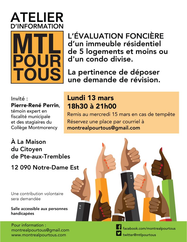 Nous avons réalisé en 2023 notre 4e campagne d’information depuis 2014. Elle a porté sur nouveau rôle foncier publié en septembre 2023. De fortes augmentations des valeurs foncières au-delà de la moyenne puis des comptes de taxes étaient au rendez-vous. Nous avons rejoint un grand nombre de propriétaires dans 3 grands secteurs de la ville lors de nos 3 ateliers de formation. Voici l’exemple de celui du 13 mars 2023 à Pointe-Aux-Trembles: